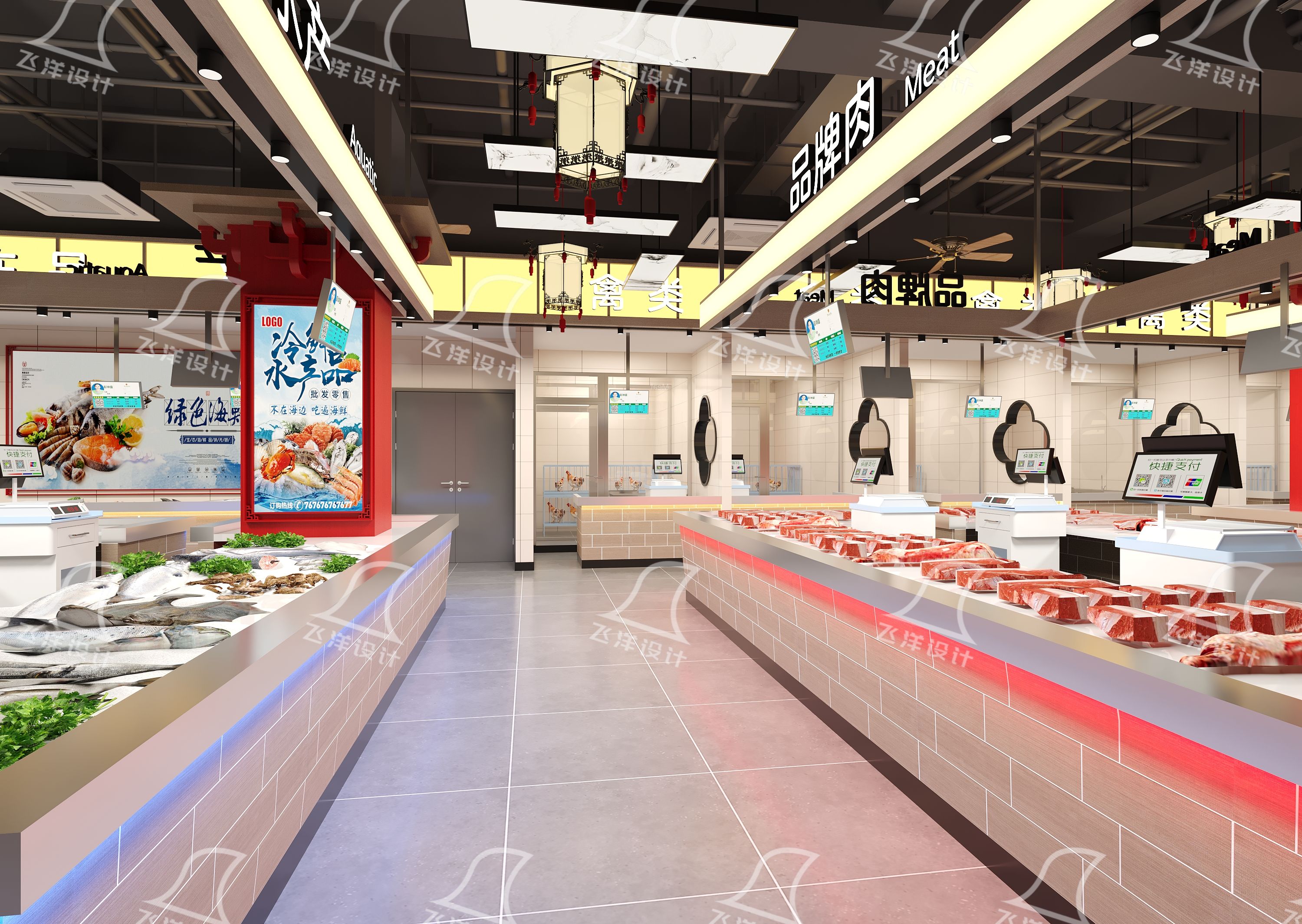 动线分级与业态耦合:采用 “主干道+组团式” 动线网络。环形主干道流畅串联各大功能区;各业态内部形成精细化组团(如蔬菜区、肉类集群、餐饮区),实现“逛”的舒畅与“购”的高效。严格实行生熟分离、干湿分区。
