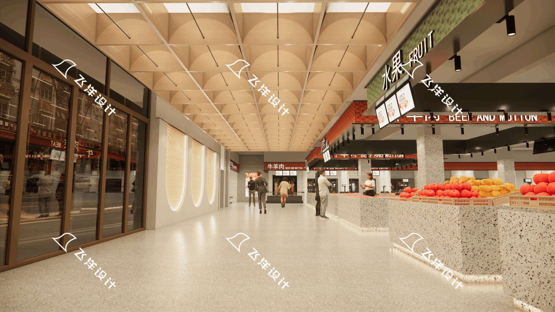 2.功能分区清晰:将水产区、肉类区、蔬菜区、熟食区、便民服务区等按消费逻辑合理布局,减少气味干扰与交叉污染。