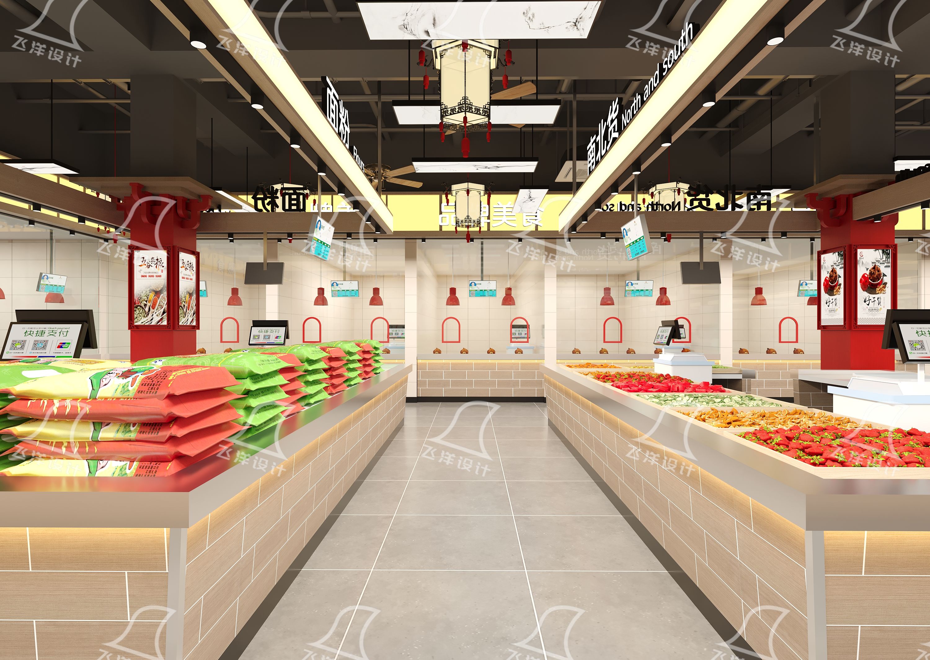 场景定义消费:美食休闲区通过灯笼、纸伞与现代餐椅的混搭,营造“市井烟火中的雅致休闲”;农贸交易区则通过特色店招、明档玻璃与灯光设计,将食材陈列提升为“视觉盛宴”。服务台区域的圆形木质台与山水背景墙,则传递出温暖接待的仪式感。